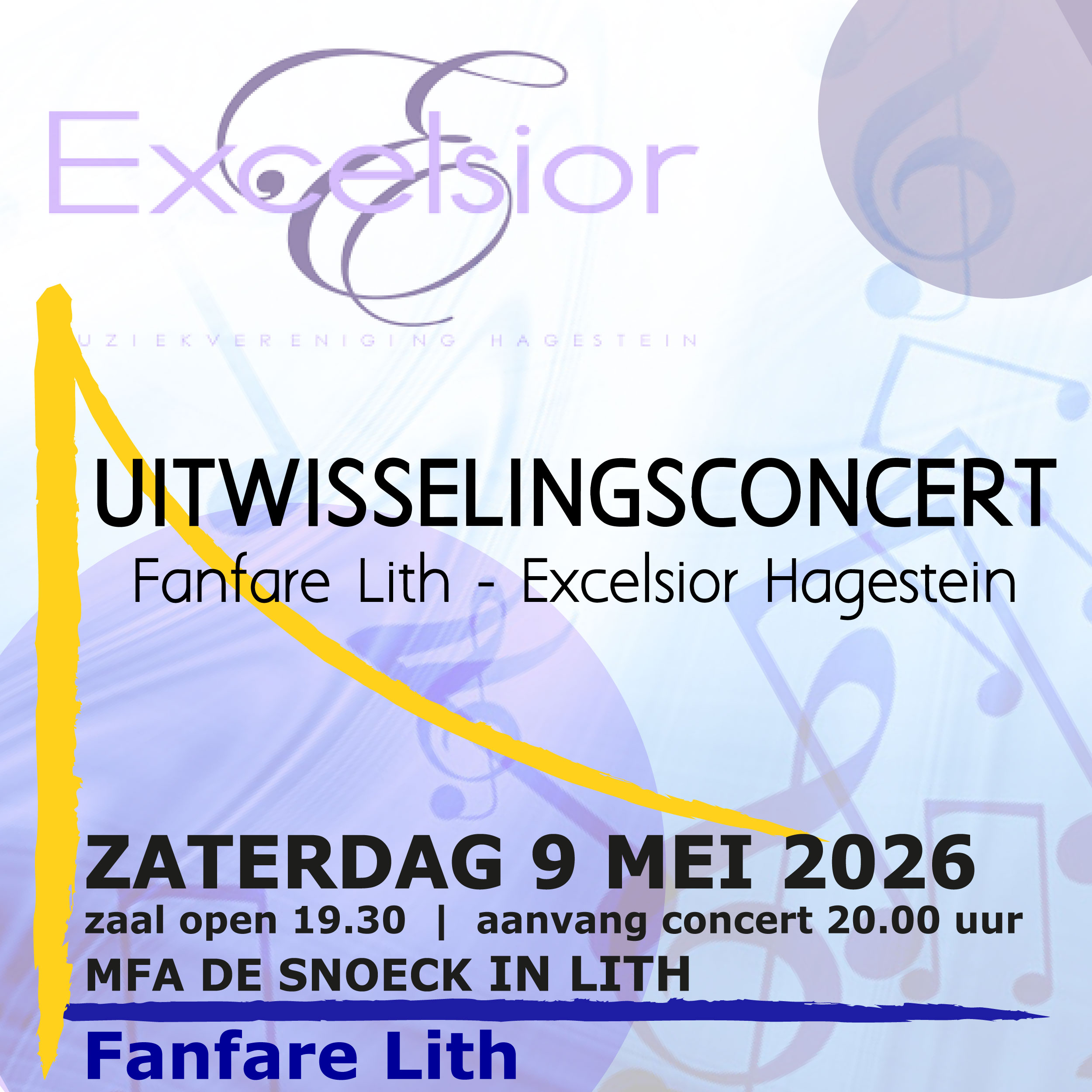 Zaterdag avond 9 mei geven we samen met Muziekvereniging Excelsior uit Hagestein een concert in MFA de Snoeck in Lith. Tijdens dit concert spelen beide verenigingen een eigen programma en aan het slot zullen twee gezamenlijke nummers te gehoren brengen: een indrukwekkend fanfare werk "When Nature Strikes Back" en het mooie ingetogen "A Flower Remembered".